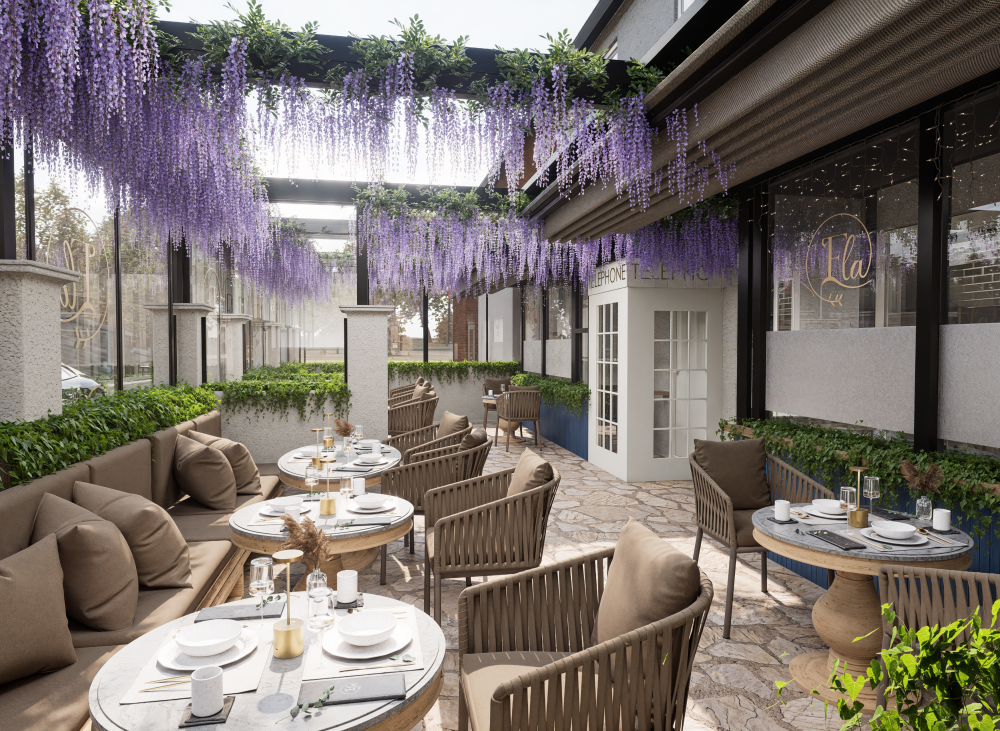 The design approach is identity led and context aware. A white and blue palette, lightweight columns, and integrated planting are aligned to existing façade datums to maintain streetscape rhythm. Inclusive design principles have informed the layout; with level access and flexible seating arrangements intended to support a range of users, subject to detailed configuration.