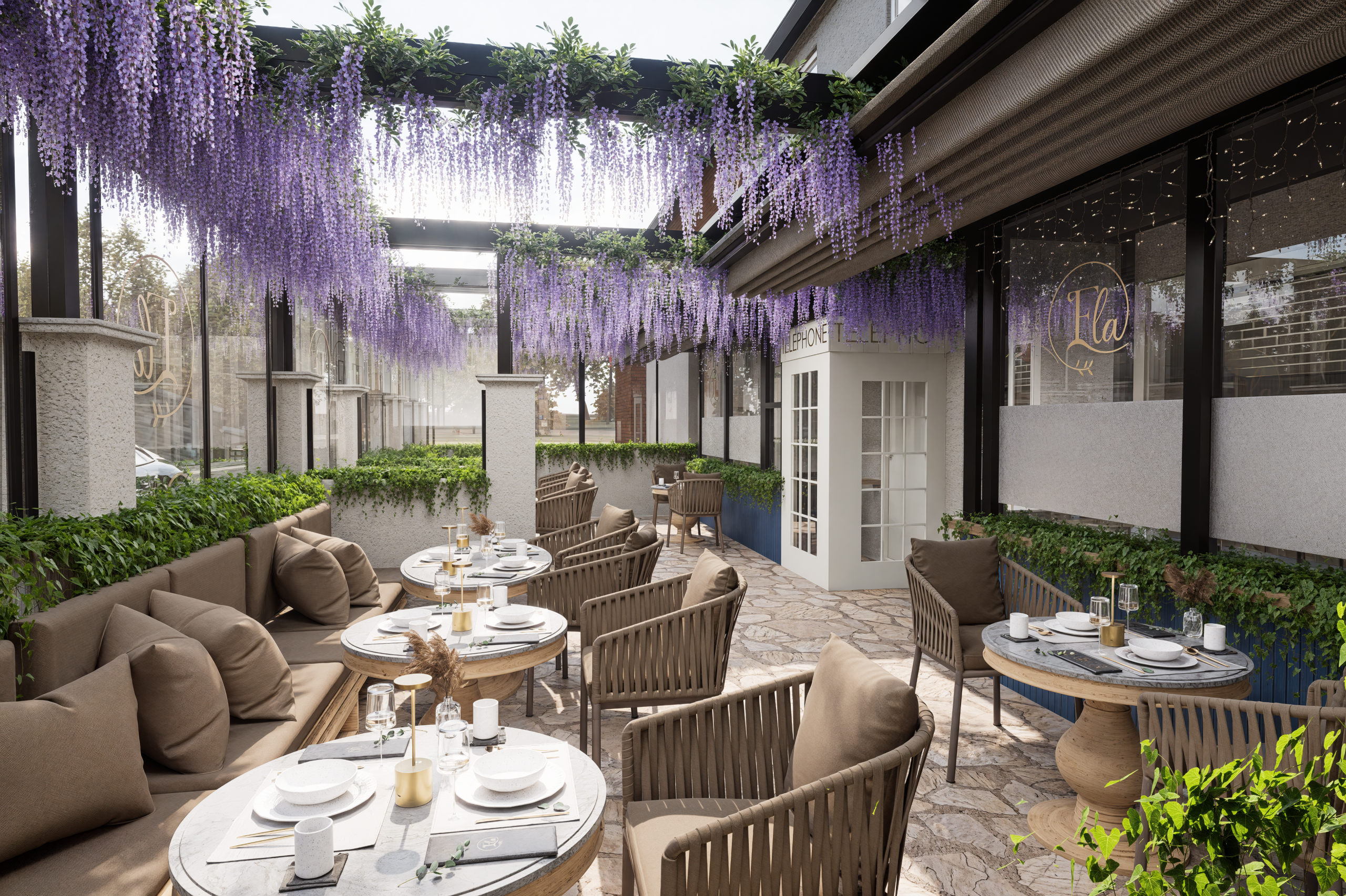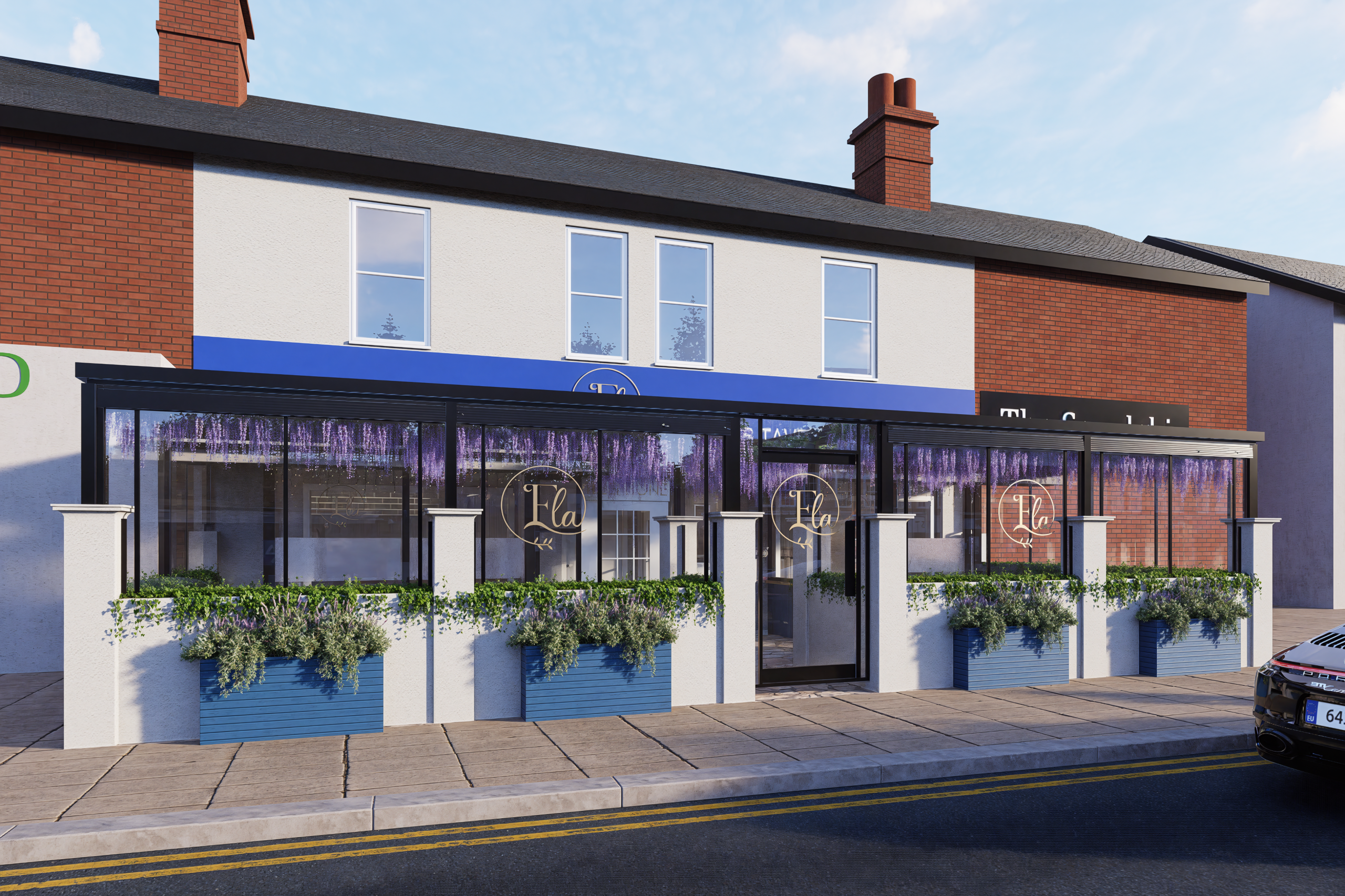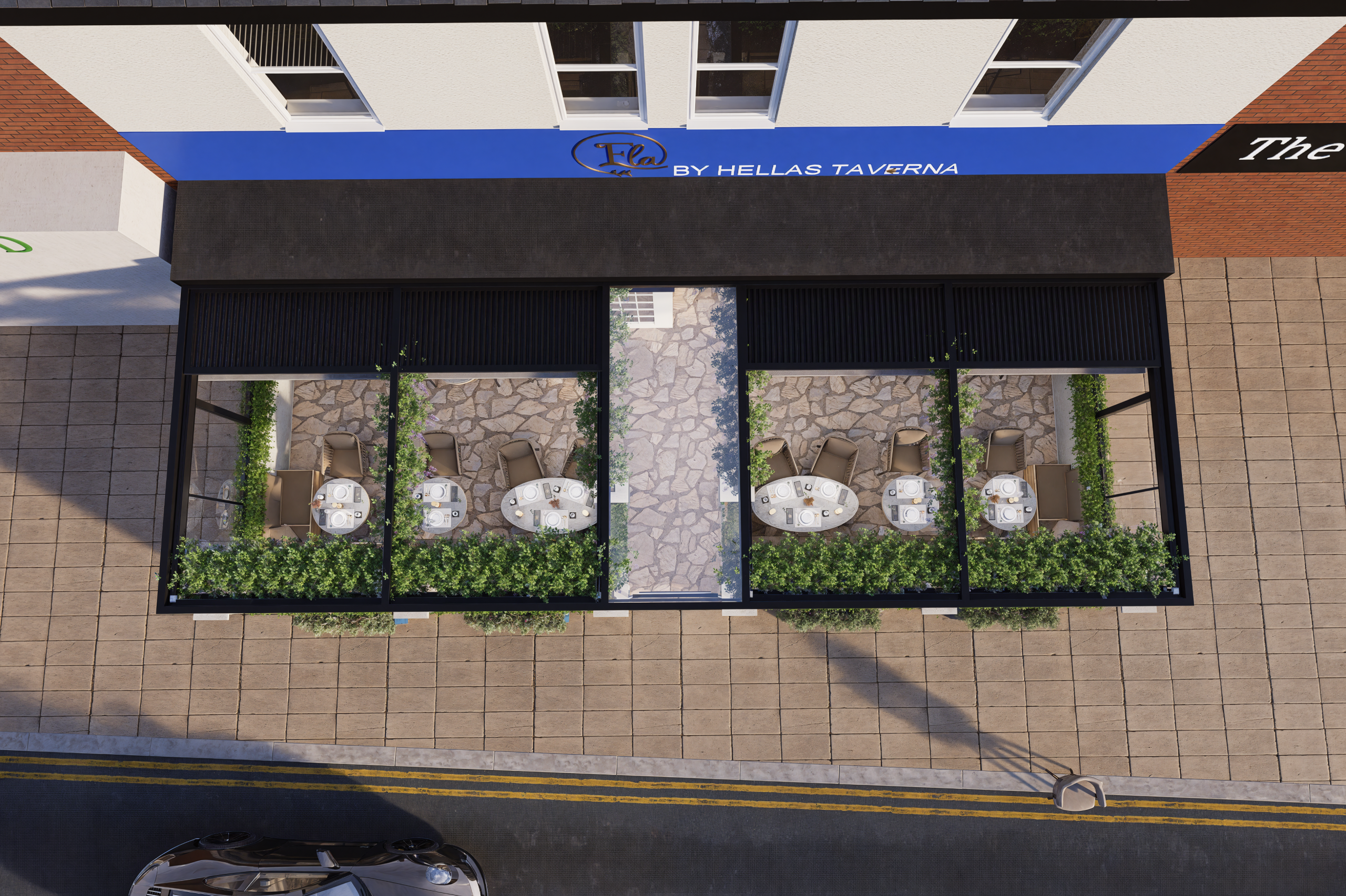 The design approach is identity led and context aware. A white and blue palette, lightweight columns, and integrated planting are aligned to existing façade datums to maintain streetscape rhythm. Inclusive design principles have informed the layout; with level access and flexible seating arrangements intended to support a range of users, subject to detailed configuration.
