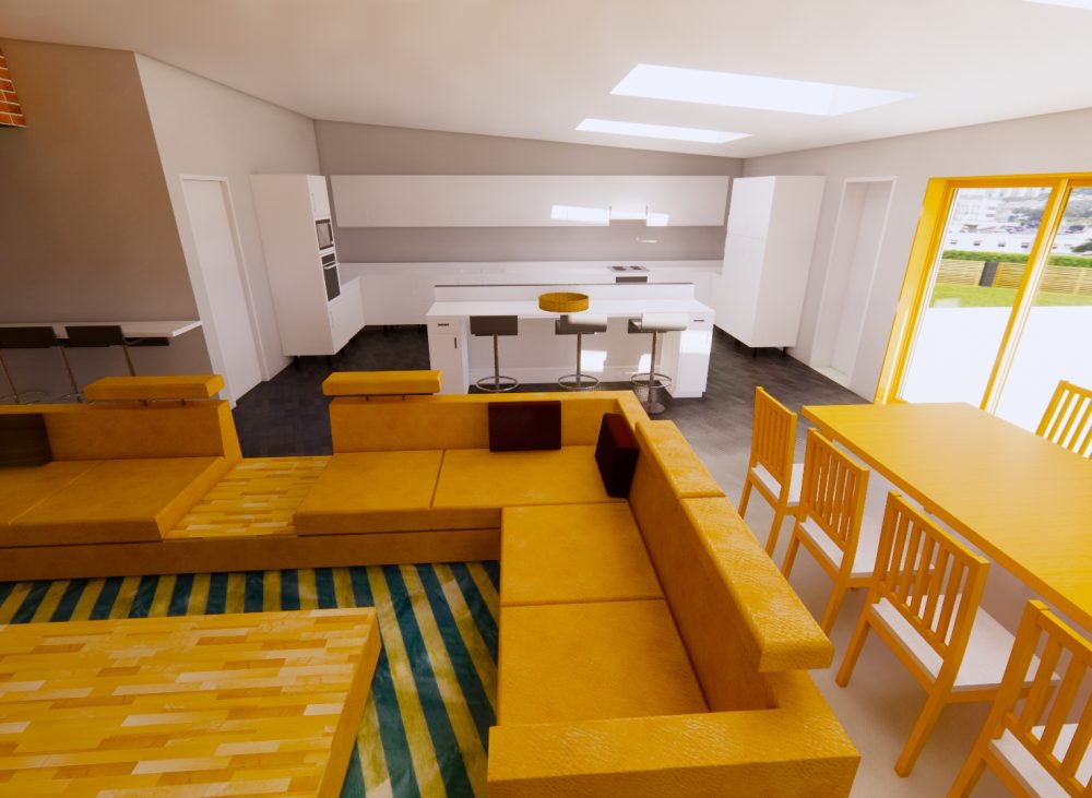 CGI visuals were prepared to test and communicate the internal experience at an early stage. The images illustrated an open plan living, dining and kitchen environment; rooflights to bring daylight deeper into the plan; and large glazed openings to strengthen the relationship with the rear garden. Axonometric and massing views were also produced to help align design intent with buildability, showing a robust brick envelope, a simple primary roof form, and a restrained rear element with rooflights and wide doors.