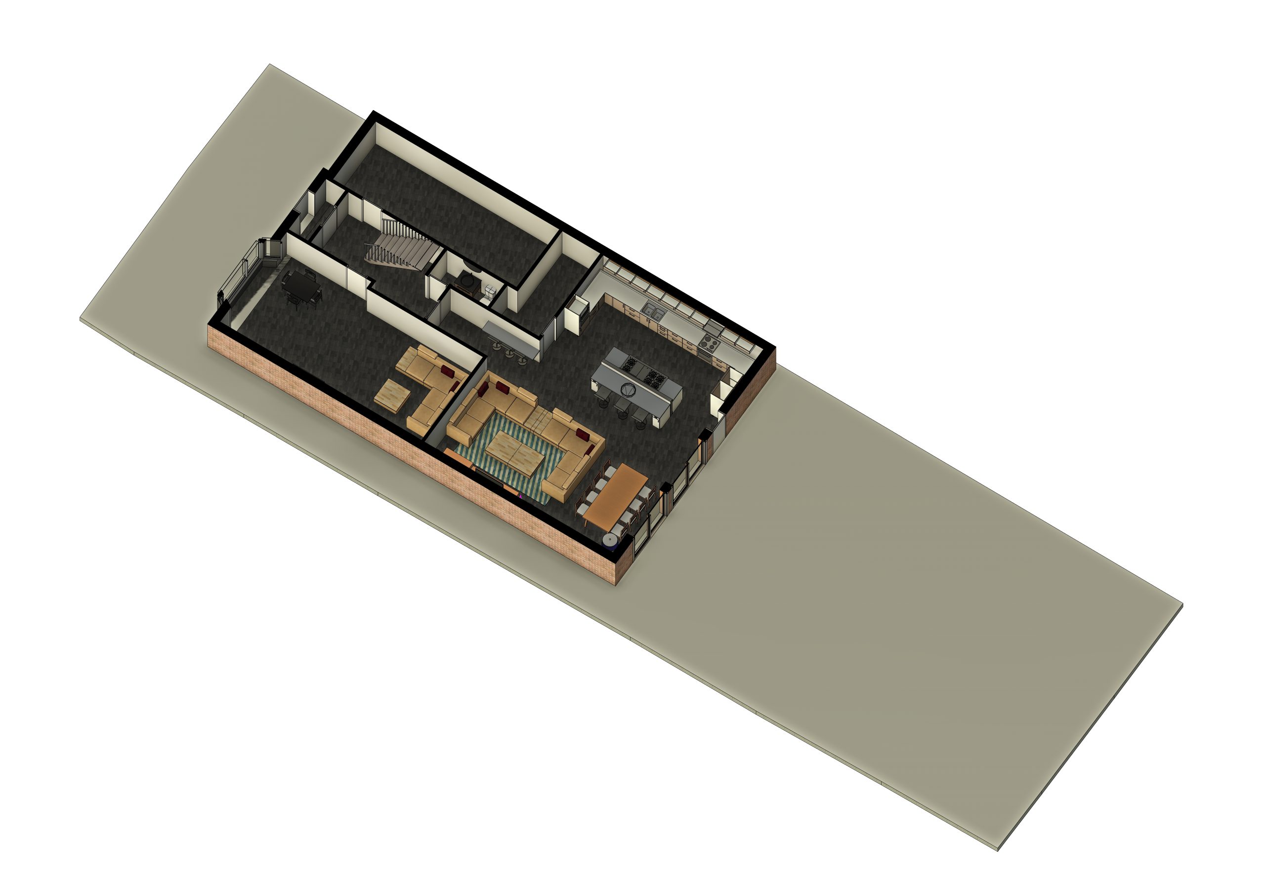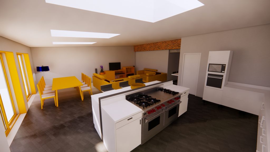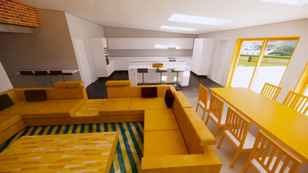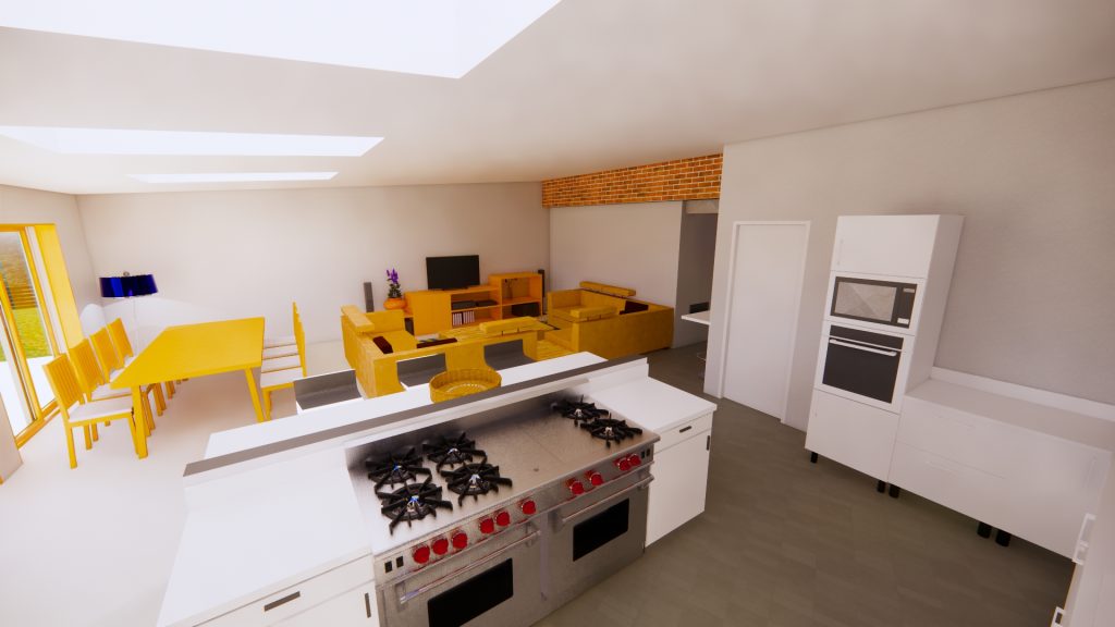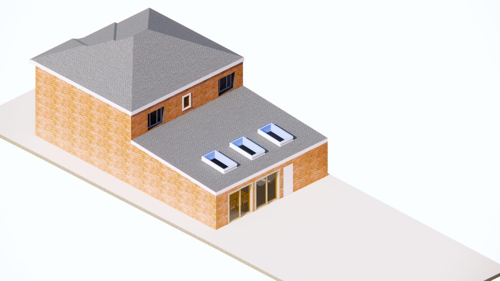 CGI visuals were prepared to test and communicate the internal experience at an early stage. The images illustrated an open plan living, dining and kitchen environment; rooflights to bring daylight deeper into the plan; and large glazed openings to strengthen the relationship with the rear garden. Axonometric and massing views were also produced to help align design intent with buildability, showing a robust brick envelope, a simple primary roof form, and a restrained rear element with rooflights and wide doors.