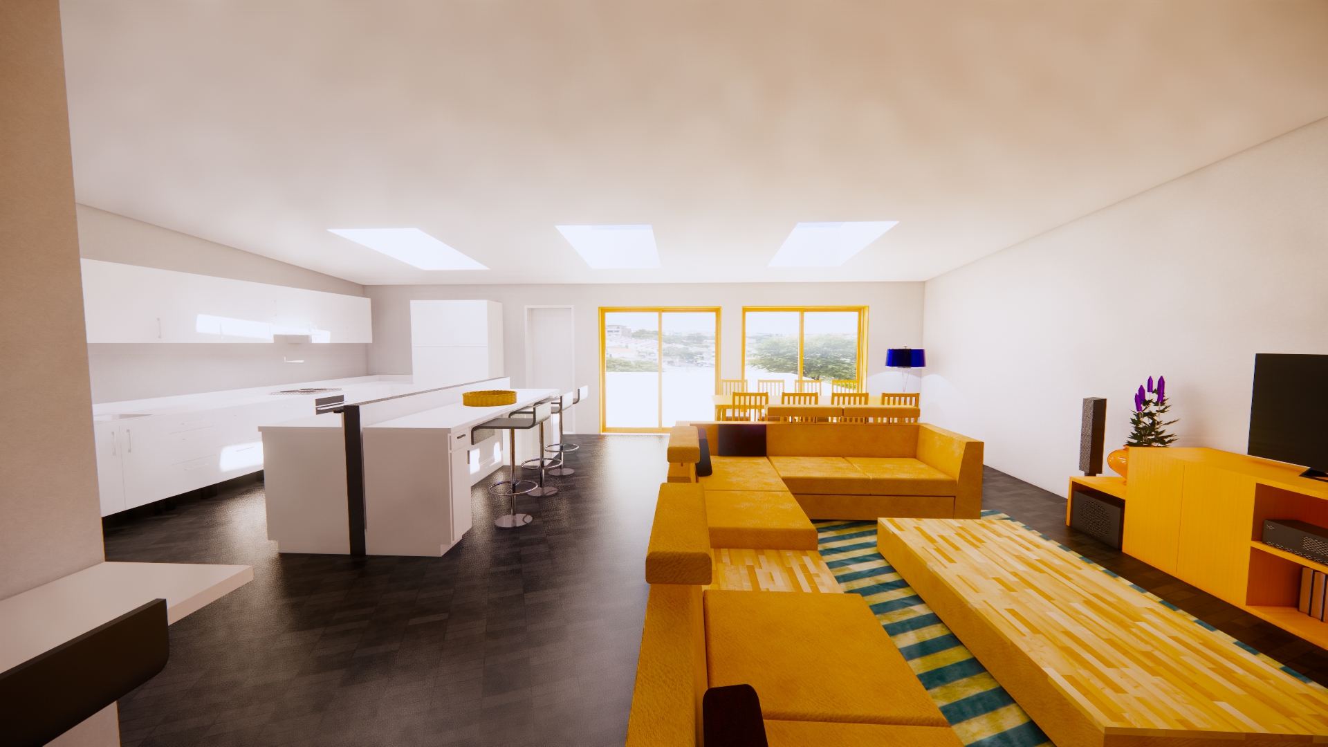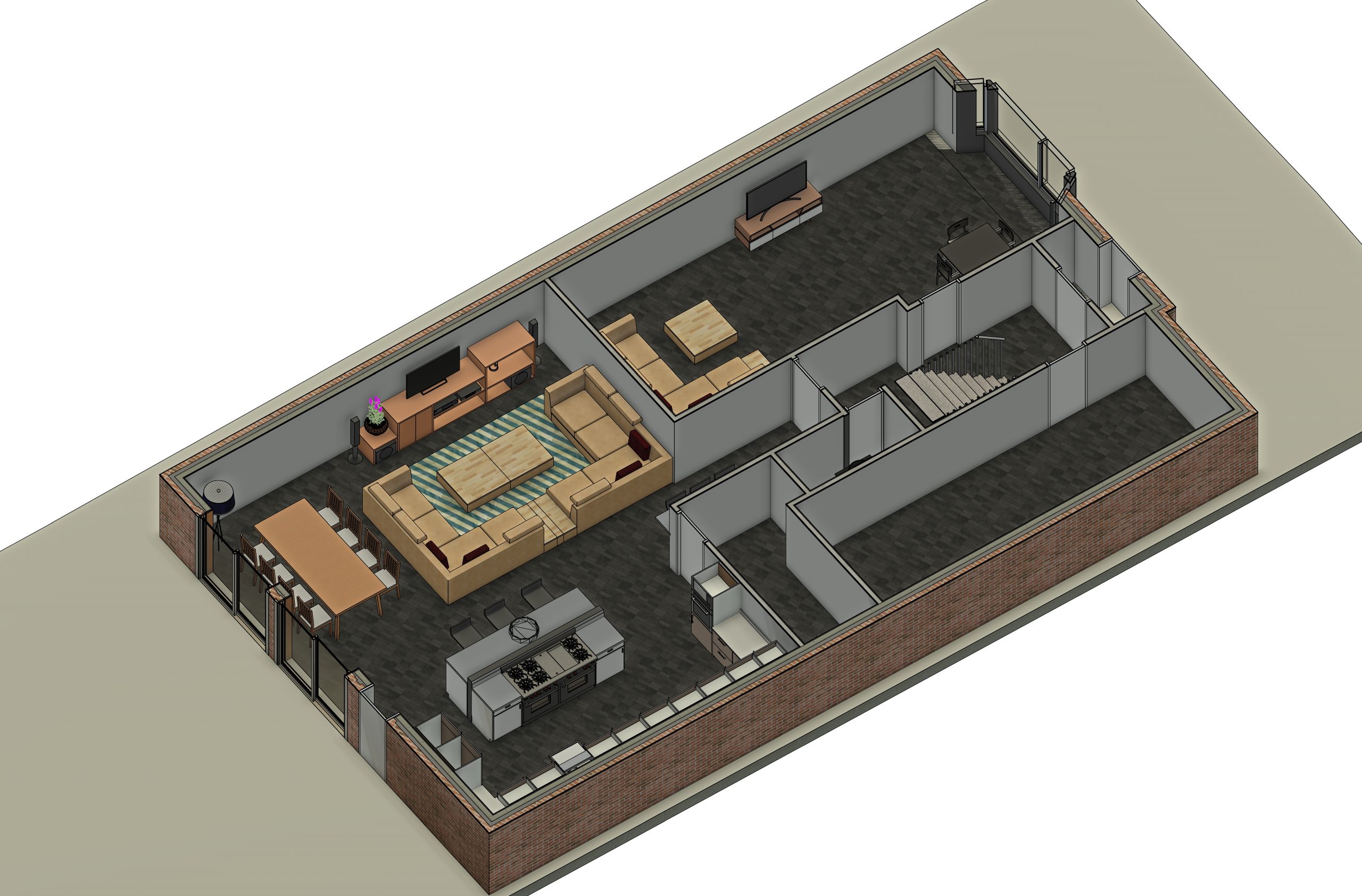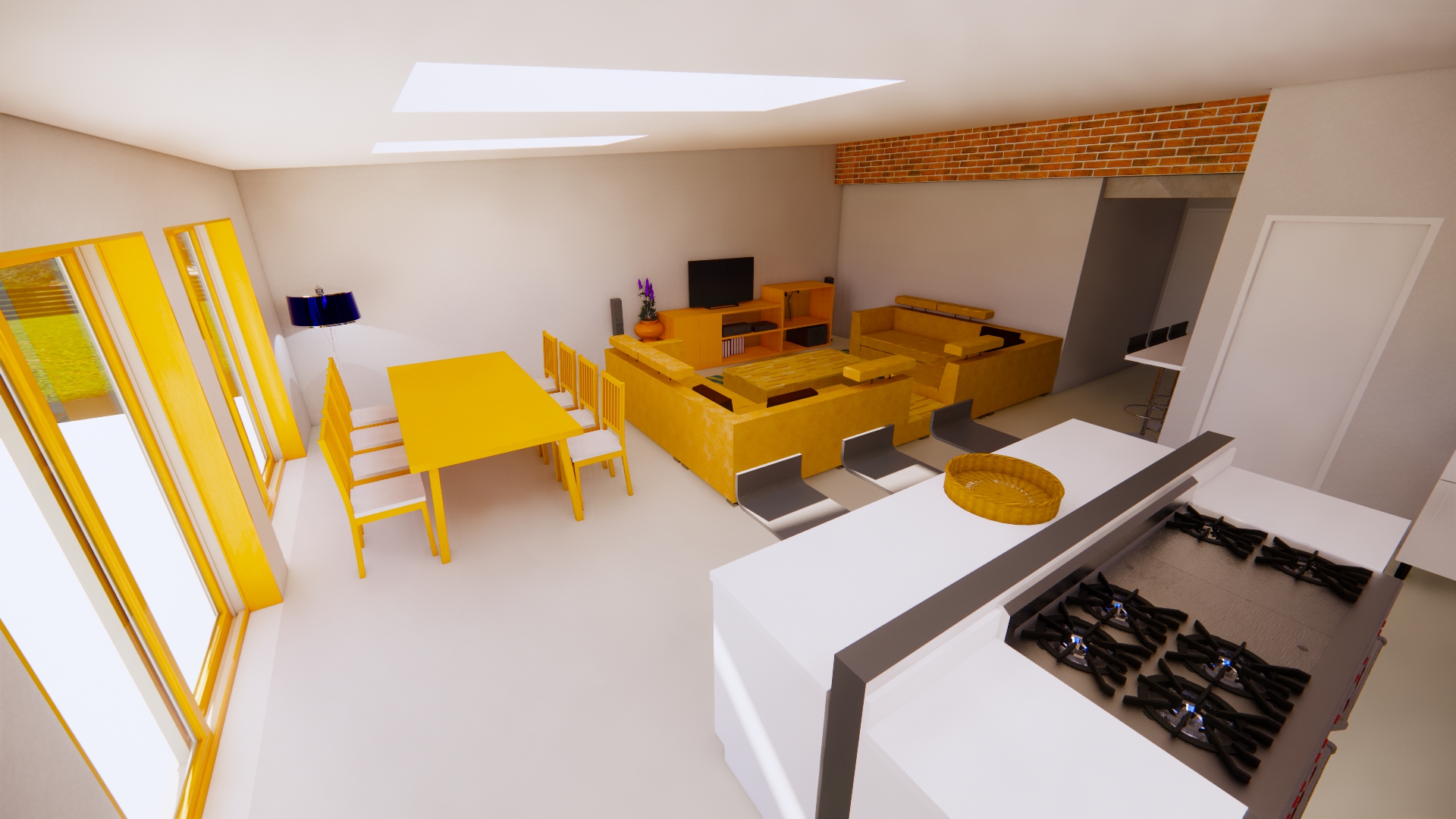 CGI visuals were prepared to test and communicate the internal experience at an early stage. The images illustrated an open plan living, dining and kitchen environment; rooflights to bring daylight deeper into the plan; and large glazed openings to strengthen the relationship with the rear garden. Axonometric and massing views were also produced to help align design intent with buildability, showing a robust brick envelope, a simple primary roof form, and a restrained rear element with rooflights and wide doors.