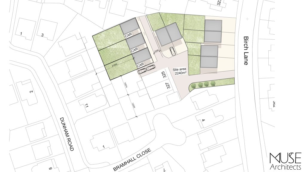 The residential development was delivered within the curtilage of an existing dwelling, maintaining access to both the existing and new homes, regarding Nos. 325 and 327 Birch Lane, while retaining usable private garden space.