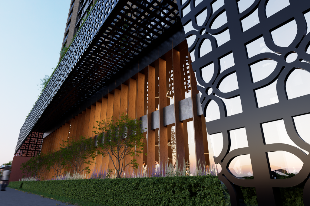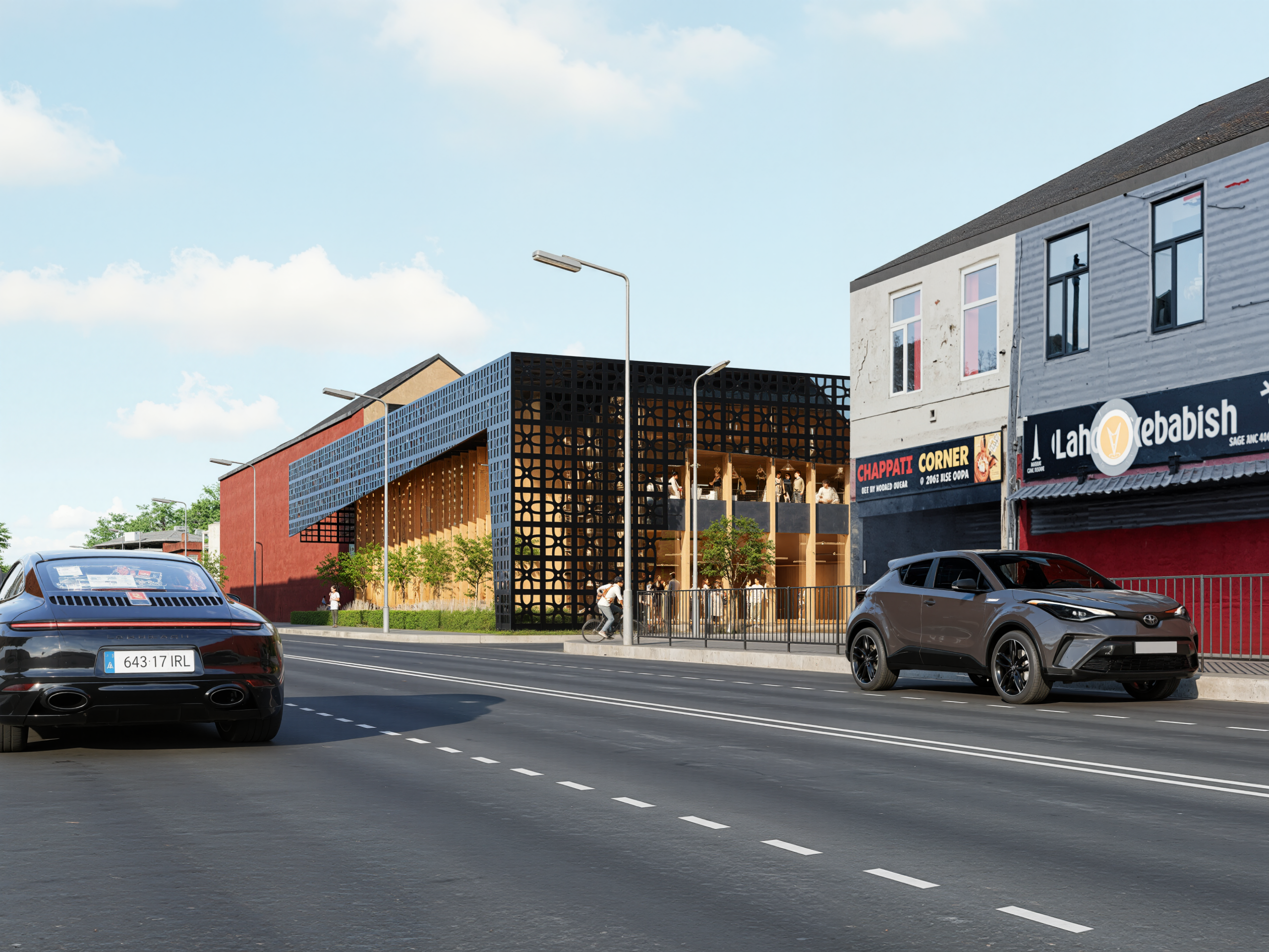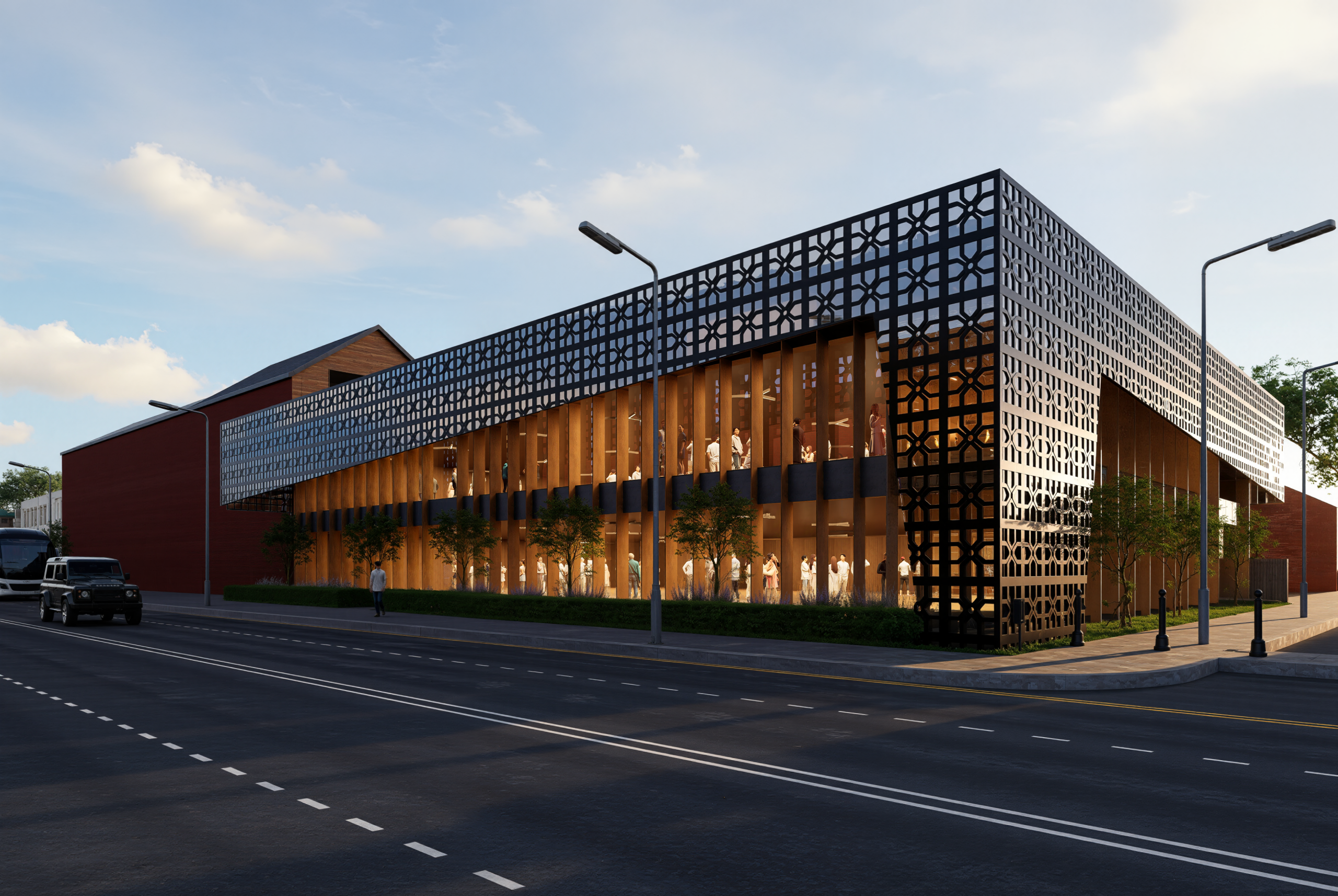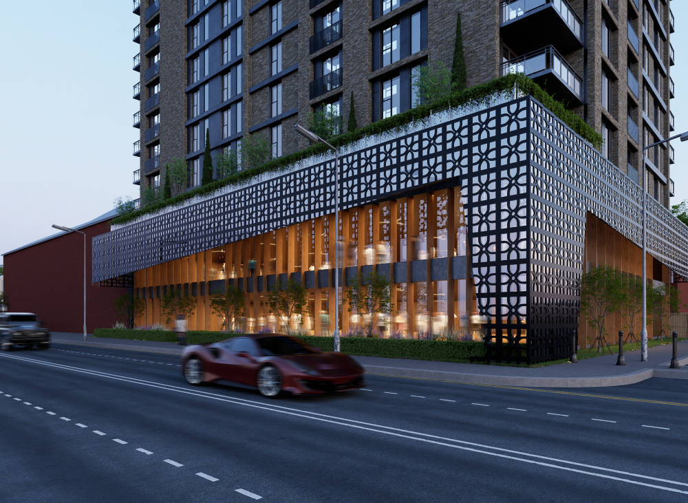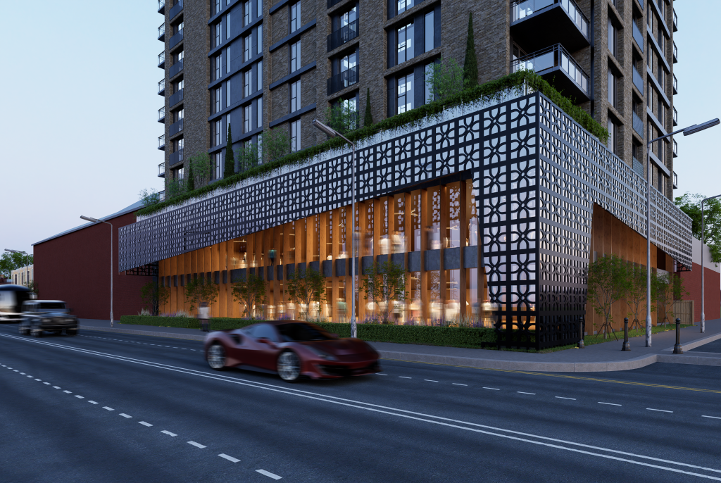 The first floor is planned as the primary events level; integrating a stage, bar, buffet area, kitchen, and supporting storage to enable higher capacity functions and managed hospitality operations. The architectural expression is contemporary and brandable; using a transparent internal volume framed by vertical elements and wrapped with a patterned screen layer; creating a strong frontage identity and controlled daylight. CGI led visuals communicate massing, streetscape presence, and visitor experience, supporting early stakeholder engagement and pre application discussions.
